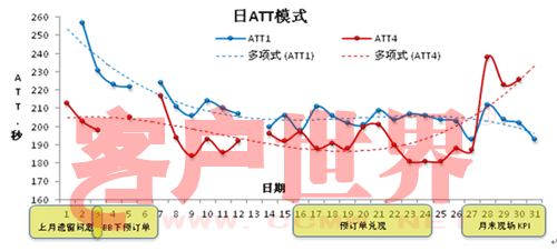 从上图可见,月头的上月遗留问题(配送不及时、到货差异破损、帐务问题等)、月末现场冲刺KPI等客户流程因素对ATT有明显影响。需要特别说明的是,4月27日后ATT有一个明显的扬起,这是客户业务政策调整的直接反应,在下一节中详细分析。