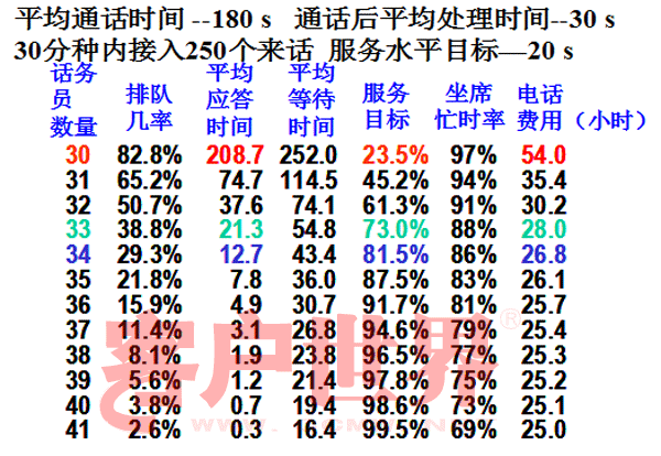 服务水平与通话量、服务时呈反向关系,与座席数目呈正向关系。为维持目标水平,当通话量、处理时长增加时,就需要增加座席,反之,座席数目则可以适当减少。