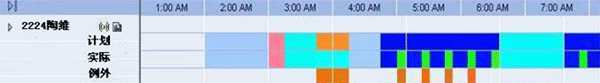 如图,通过与PBX、CTI系统的接口,排班系统获取座席的实时状态信息,如登录、接听、话后处理、登出等,并以不同的颜色进行表示,与计划的班次安排进行比对,从而监控到座席的遵时例外(非遵时)。通过这种方式,座席的实时状态变化能够及时的得到监控,便于管理人员精确的监控遵时,同时,也把班长从遵时管理中部分解脱出来。