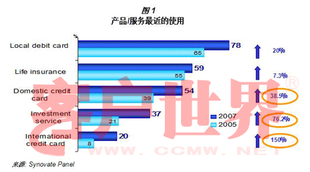 中国消费者比起过去来说,对于金融产品有了更多的需求,因为他们现在购物越多,消费也越多。在2005年, Synovate从中国地区中抽出第一级城市(北京,上海及广州)的850个消费者,为对其使用的金融产品进行度量,而做了一次电话调查。当地的借记卡最广被使用,占受访者的65%,国际信用卡的拥有率只有8%。在2007年,Synovate再在这850个受访者中,成功回访了其中超过300个被访者,以度量他们在过去两年中在他们的银行行为中所发生的变化。调查表明,类似的产品仍然在被使用;然而,所有产品的使用率都有了巨大的增长。图1很明显的指出了2007年金融产品与服务使用率的增长,特别是国际信用卡的使用率增加了3倍,投资服务的增长超过了75%,并且国内信用卡我们也看到了大约40%的增长。更重要的是,这些产品在未来一年中,预计仍会进一步增加。对于所有金融服务的服务商来说,这当然是个好消息,因为这意味着积极的势头仍然在延续。