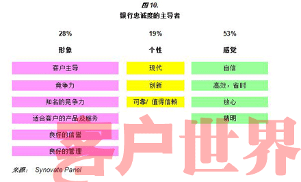 有趣的是,情感动机无论是在中国还是海外同样在建立忠诚度中扮演了重要的角色,无论是在银行业或是其他行业中(图9)。基于Synovate全球的经验,我们发现,情感动机在耐用消费品及公用事业的忠诚度中拥有主导影响。甚至在竞争激烈的B2B情况中,情感和理智扮演了同等重要的角色。因此对银行来说,全球的情况和中国同样是相似的。
