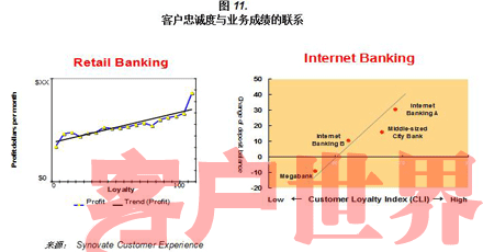 经过这几年,我们发现客户满意度转变成了商业成绩。在图11的案例研究中,你可以看到一个零售银行和其他网上银行中,当客户忠诚度提高了,利润及整体的定期存款额也跟着增加了。