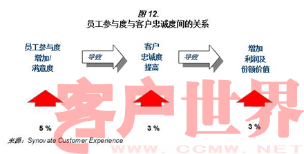 另一个银行的例子(图12),除了正在运行的客户忠诚度度量项目,银行也追踪其员工参与度。在这个案例中,可以发现,在员工参与度和客户忠诚度间有着紧密的联系。表现在,5%的员工参与度的增加会引起3%客户忠诚度的提高,更会在利润和股份价值上有3%的增加。这是因为员工每天都会和客户互动;如果他们展示了很高的参与度,他们更能以关怀和积极的反应来提供银行对客户的承诺和支持银行的战略,提供零缺点的服务,并且超越一般职限提供非凡的客户体验,以此建立客户的忠诚度,并因而使银行获利。