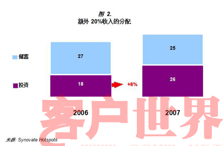在另一项由Synovate在2006年为发展中市场所进行全球性调研中,中国消费者宣称,他们会将更多的钱进行储蓄,而非投资,除非他们的收入增加20%,其中27%会放入储蓄,18%用来投资(图2)。一年后,在态度上有了明显的转变—更多的人愿意进行投资。现在,相同比例的人都愿意拿出额外的20%的钱用于储蓄及投资。随着市场进一步的开放,以及人们对金融产品和服务知识的进一步增加,对于金融产品的兴趣也将进一步加强。