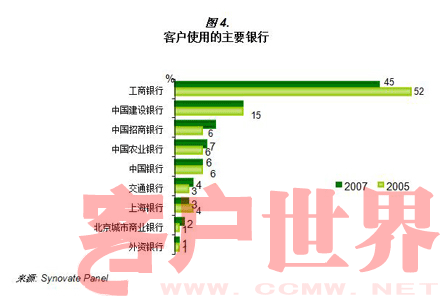 图4显示了,2005年至2007年追踪小组所使用的银行。从表面可以看到,除了工商银行,其他一些主要银行的使用非常稳定。虽然消费者越来越不满,但似乎他们还是“忠诚的”。