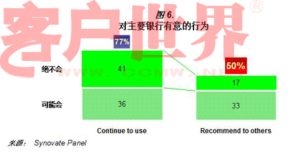 更仔细的看这些小组成员,虽然超过75%的人声称会继续使用他们的主要银行(之前提到过),但只有一半的人愿意把他们的主要银行推荐给家人和朋友(图6)。根据我们对忠诚度研究的经验,在“持续使用”和“推荐给他人”间的差距比平时更大了。这就表明,许多中国银行客户的的忠诚度在本质上是非常薄弱的。一方面,客户不愿意推荐他们的银行是因为他们也许不认为他们的银行比其他的要好。他们倾向于维持目前的银行,因为他们没有看见更好的选择,或者觉得改变是件很麻烦的事。所以必须意识到的是,这样的“忠诚”是被动且暂时的。当在市场中给予了一个更好的选择,这些客户会毫不犹豫的转变。