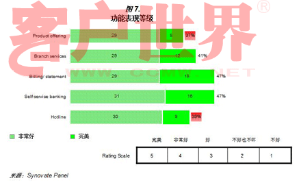 满足客户功能需求是拥有客户满意度的先决条件。许多公司把功能满意度作为衡量客户忠诚度的标准;这些功能往往是影响客户理性忠诚的客户体验点,例如:品牌服务,利息,客服热线等等。在中国所提供的不同类型和等级的服务(图7),由于在许多功能领域因为等级普遍不高,所以有很多改进的余地。特别是关于金融产品提供和客服热线,只有40%不到的客户认为其是很棒或者非常好的。这就意味着,中国的银行很可能连客户最基础的功能要求都没有满足。因此在这些客户接触点上,在改善普通质量上仍然有很大余地。