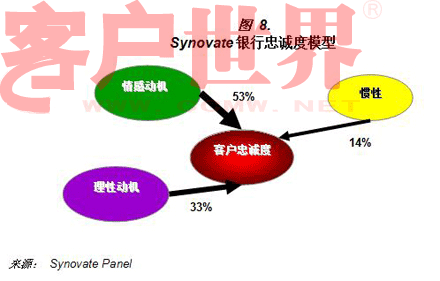 我们在中国进行的小组研究中,在客户忠诚度上,理性动机有着很大的影响,并且也有惯性的特殊影响越为安静的客户,他们就对转换银行越不为所动。这些客户对他们所选择的银行不是十分在意,并且转换银行不值得他们花费时间和精力。这些客户尝试维持银行,不在乎他们的表现如何,除非发生了特别糟糕的事。在我们的分析中,我们发现,在中国影响忠诚度最重要的部分是情感动机,这就表明,中国的银行要增强与客户间的关系,除了满足客户的功能性需求,必须和他们建立情感上的联系。