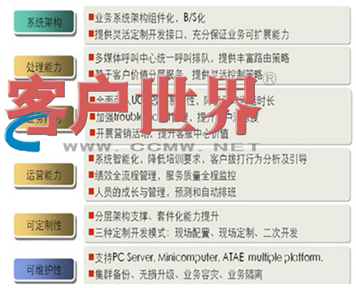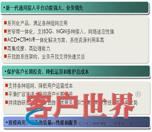 ♦ACD/CTI/IVR一体化联络中心解决方案, 满足客户服务中心应用,外包应用以及IVR增值业务应用.