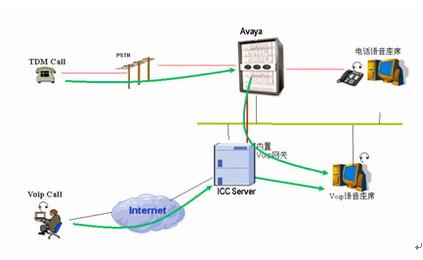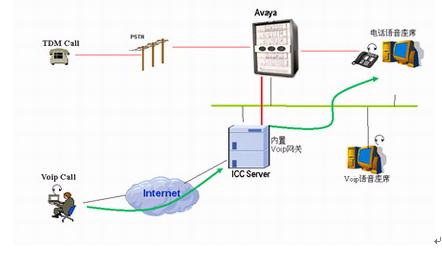 通过Internet来的Voip呼叫通过ICC服务器的内置Voip网关转换为电路形式的电话,呼叫交换机,分配到座席。