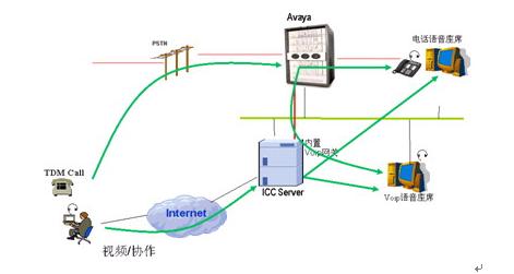 通过Internet来的Voip呼叫通过ICC服务器转接到座席。