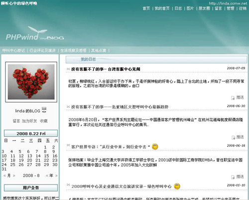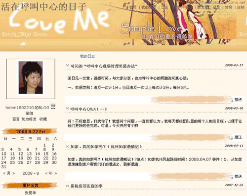 2006年底开始她便开始在客户世界的博客上写文章,因为很想有个平台和众多人士分享和交流一些呼叫中心管理与技能方面的东西,通过了解,她获知客户世界是国内最专业的呼叫中心平台,不久便毅然决然的在客户世界开通了博客。