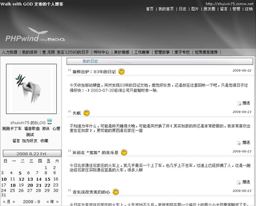 “你读xx的博客了吗?”现在在很多人的生活中,这句话成为了时下最流行的问语。不仅在我们可以听到这样的声音。在行动上,事实也是越来越多的博友(写博客的人),越来越多的读家(读博客的人)将写作与阅读放于其上并且乐此不疲。其实很多人都很明白博客这个概念。对于普通人来说,在网络上写作就是种乐趣,是联系朋友的纽带;然而,对于一些名人来说,博客也是作秀的一种手段,因为通过文字的交流,他们可以赢得更多的粉丝,并且依靠名人的人格魅力吸引更高的支持率。有了博客,明星也好,百姓也好,大家都可以在这个平台里,通过网络感受彼此的生活。这种幸福也只有在网络时代我们才可以享用!