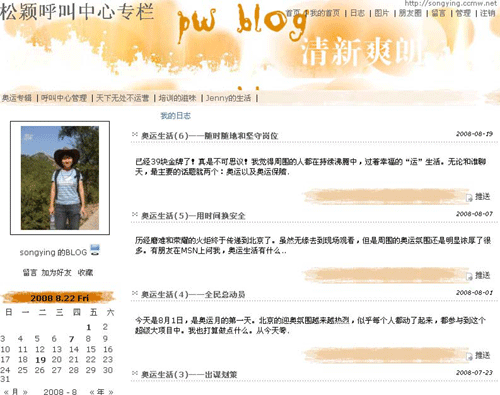 作为管理专家的松颖女士也是客户世界的重要支持者,毕业于香港科技大学获得硕士学位的她,从事呼叫中心运营有10年多。作为一个行业专家,在她的博客上,让很多客户世界的读者也收获了很多知识,最近在她的博客上也开通了奥运专栏。当记者采访她的时候,她回忆了和客户世界相处的点点滴滴。选择客户世界开通博客是偶然的。本来只是想尝试下,结果却一直坚持到现在。她说:“CCMW对我来说有着特殊的意义。这里的读者和我有着类似的经历,有着共同的话题:呼叫中心。一个简单的地址联系着我和同行的朋友们,一个专属的虚拟空间也记录着我的点滴感受和视角的改变。”