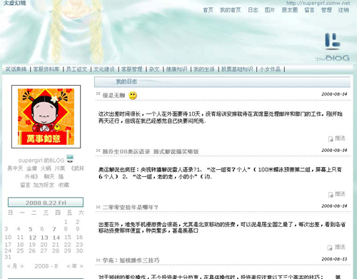 在客户世界的博客世界里,还有很多的草根写手,小狐狸的博客就是一个典型。她的主人是礼意久久(北京)电子商务有限公司客服部的主管李丽艳。2007年3月20日他在客户世界也开通了开博,和很多的人一样,他的博客上留言很多。她说,从开博到现在,倒没有想过会有多少人过来点击,只是觉得写自己的东西,大家都有发表各种言论的自由。觉得自己离专家的距离还很远,需要一步一步踏实的前进才可以。