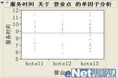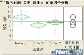 相反地,如果得到的结果与图二所示类似,显然说明三家酒店在这方面的服务水平有明显的差异。具体来说,hotel3的服务水平最好,其平均服务时间仅约为3.0分钟;hotel2的服务水平其次,其平均服务时间约为8.7分钟;hotel1的服务水平最差,其平均服务时间竟约为14.0分钟。