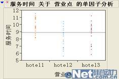 背景介绍:XX酒店是一家颇具规模的国际酒店集团,仅在中国上海就同时拥有三家五星级的酒店。通过第三方咨询公司的研究报告,中国地区的管理层已经意识到客人的回头率与他对酒店的第一印象密切正相关,而从客人在前台登记起到其行李被送达到客房的服务时间长短是与影响客人第一印象的重要因素之一。那么,目前公司内部不同营业点的表现如何呢?为此,公司先花了一周时间在上海地区的三家酒店进行了现场抽样调查……当我们收集到相关的数据后,可以用一幅合适的统计图形观察一下总体状况。如果得到的结果与图一所示类似(橙色代表来自hotel1的抽样数据,蓝色代表来自hotel2的抽样数据,棕色代表来自hotel3的抽样数据),显然说明hotel1、hotel2和hotel3三家酒店在这方面的服务水平非常接近,平均服务时间均为8.7分钟左右,仅存在一些随机波动,没有明显的优劣之分。