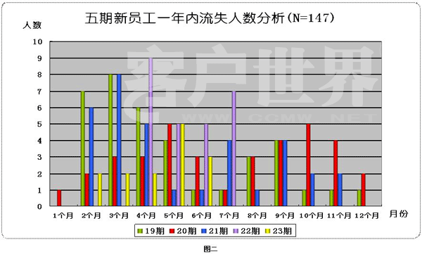 从数据观察,在新员工入职的后6个月左右,出现一个20%左右的离职率,就总体离职情况分析,成为当期员工离职的比例高峰区。也可以理解为,在新员工入职后6个月,对员工进行有效的离职干预,可以缓解总体流失情况发展。从员工入职培训开始,依据收集的资料,进行培训内容调整,从根本上缓解员工不良内心体验,成为干预流失率的重要条件之一;各中心新员工培训体系中,较少的涉及“浇凉水”的内容。也就是可以准确的、不夸张的描述工作负面情绪、事件、环境的内容。总是伴随培训师也许不认可的,较为“美化的”远景描述,形成新员工脱离现实意义层面的理解与期望,此现象在较大程度上,造成员工早期离职的情况发生。随着这些过高期望员工的流失,在入职后的第三个月,多数离职数据呈现增加的规律。此事呈现的心理层面的意义为:由于80后在责任、忍耐、坚持等人格特征上的不良教育结果因素影响,出现以“逃避”为主策略的处理困难风格倾向。想要缓解此问题,不能单独的从任何一个角度出发,因为员工的心理防御系统将此时的离职,多数责任外推,如:这不是人干的活!班次没有人性化!等等行业特征因素,总是充满理由的离开工作,当然这样的员工,永远也找不到他理想中的不单调的工作,在绝大多数离职员工中,我相信大多数不可能拥有满意的工作。因为离职本质是逃避责任。