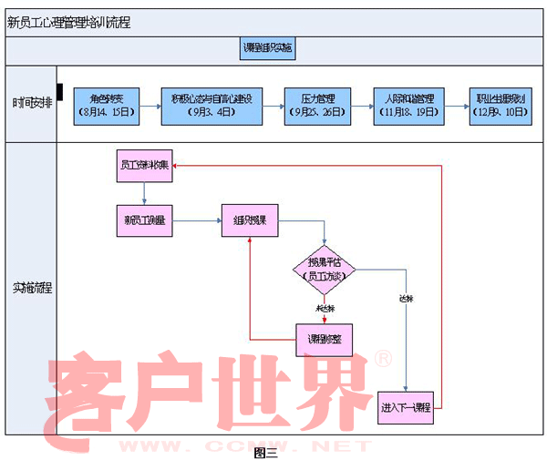 听上去好像是没有办法来缓解这样一个心理教育上的难题,这个难题的形成,具有80后教育倡导“爱”成分较多,没有任何的“责任”教育的结果。员工需要进行“再社会化”的教育补偿。企业有义务对其员工进行补偿性教育。在适当的时候,根据员工的内心体验,适时的提供教育引导,可以明显的改善员工工作态度,再次适时成为关键因素。项目组从收集数据中达到启示,制定了新员工培训节律计划(图3)希望可以通过实施的效果评估,带来启发。