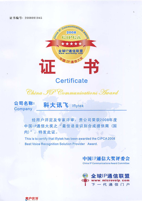 近日,在CIPCA 2008 中国IP通信大奖评选中,科大讯飞以领先的技术实力和卓越的市场表现喜获最佳语音识别合成提供商(国内)奖项。本次获奖再一次表明科大讯飞在语音合成到语音识别技术领域的优势地位得到行业的一致认可。
