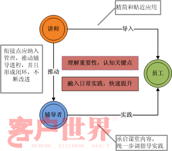 其次是辅导者。培训做为意识和技巧的导入,会让员工处在“兴奋”状态。这时候他们大多跃跃欲试,希望有所实践。如果实践过程完全交给员工自己去进行,那就容易陷入到“一盘散沙”的局面,缺少对“见效时间”的控制力。无人指导的员工,也很快会因为找不到门路、看不到效果,而失去了兴趣。有些呼叫中心会要求讲师做跟踪指导,可是仅仅“跟踪”是不够的。这个“从知道到做到”的过程,应该投入更多的管理精力。因此,除了讲师以外,还需要一个“辅导者”的角色,去带领员工实践。而承担这些角色的人,自身也需要有良好的沟通技巧做保证,并且对讲师的授课重点非常清楚。