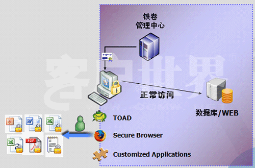 在裝有CallCenter客户端应用程序的电脑上安装铁卷电子文档安全系统的Agent程序和我们定制的安全浏览器,我们设定该浏览器只能访问特定服务器;