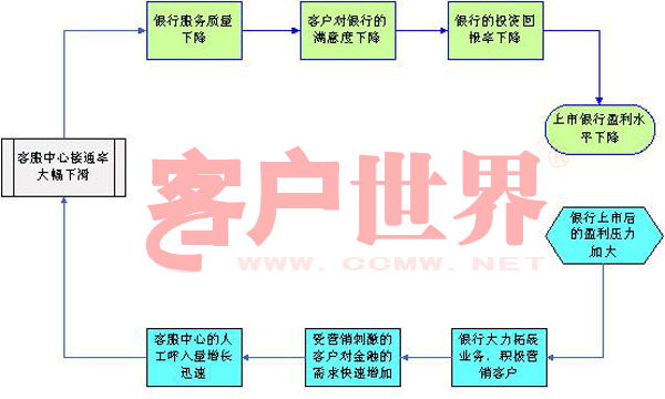 1、 银行的投资回报率(ROI)下滑。银行客户服务中心的人手紧张,工作压力加大,每通电话处理时间经常被迫压缩,引起银行客服热线的接通率和服务质量的下降,而这两个指标一向是被业内公认的客户服务中心的客户满意度测度指标,它们的下降将严重影响到银行客户服务中心的客户满意度水平。根据美国普杜大学(Purdue)乔恩.安东(Jon Anton)博士的呼叫中心投资回报率管理模型,银行电话客户服务中心的客户满意度决定了呼叫中心的投资回报率(ROI),随着大量拨打银行热线的电话无人接听,银行电话客户服务中心的投资回报率将加速下降,进而对整个上市银行的投资回报率产生影响。