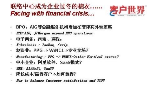 当然,呼叫中心也成为了很多企业在金融危机中过冬的棉衣。我这里举几个例子,第一就是外包。菲律宾的外包是发展非常迅速的,AIG、JPM这两个公司都相继宣布了在菲律宾扩充它的坐席,利用外包来抵挡金融危机的寒流。在电子商务方面,我相信大家对淘宝和携程都非常的熟悉,它是将呼叫中心和互联网的结合的典范。制造业,相信大家都知道,这次金融危机对中国的出口制造业冲击非常大,制造业能否借鉴PPG、VANCL这种模式?PPG现在已经不行了,但他采取的这种直付营销在中国一个探路者吧。目前VANCL是做的比较好的,他克服了PPG原来在质量上控制方面的问题,通过呼叫中心不断的卖衬衣,卖裤子、现在卖浴巾了,不知道它下一步还会卖什么,但我知道原来很多只和一线厂家找交道的纺织厂也通过VANCL来销售了。也许通过呼叫中心可以将我们的中小企业和制造业出口滞销这一块盘活。对于中小企业来说,阿里巴巴用诚信通和中国贸易商聚集了我们国家很多中小企业,现在阿里也提出来用阿里软件为这些中小企业提供一种软件即服务的模式,让它能够以更低的成本去运营这个公司。这里面呼叫中心也是非常重要的一块,所以华为和阿里软件也是战略合作伙伴。我们在金融危机的冬天怎么样来过冬,这是每个企业都需要考虑的问题,我相信呼叫中心能够成为大家过冬的一件棉衣,我觉得应该细心的思考,做一些改变,我觉得呼叫中心可以在里面起到非常重要的一个作用。