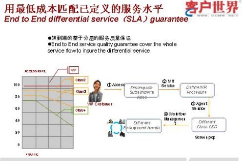 第二个就是我们怎么样用最低的成本保证IVR,或者是客户服务水平,在这方面我们也推出了基于服务水平的质量保证。就是说只要一个客户进来,只要分层以后会有不同的服务水平的承诺,然后有不同的IVR的处理,有不同的坐席策略来处理,后端的工作流的处理时间和优先级都是不同的,这样就保证大部分客户能够用最小的服务成本支撑起来,我们可能是需要为我们所有的客户提供一致的服务,但实际上我们没有必要为一些比较低端的,或者是不产生太多价值的客户提供高价值客户的服务,所以我们在这一块的思想是基于服务水平的承诺。