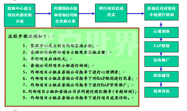 2007年11月,中国移动江苏公司客户服务中心EAP计划正式启动,这是中心为全体员工献上的一份特别的“精神福利”。 EAP(Employee Assistance Program),中文被译为“员工帮助计划”,是由组织为其成员设置的一项长期的、系统的援助和福利计划。它源于20世纪40年代的美国,目前美国中型和大型企业的EAP普及率为60―70%,英国有将近113个组织提供EAP服务、2200万员工享受EAP服务,而在我国近年来也有许多企业开始运用EAP服务,中国陆续召开了三届EAP年会,越来越多的企业开始关注员工的心理健康。