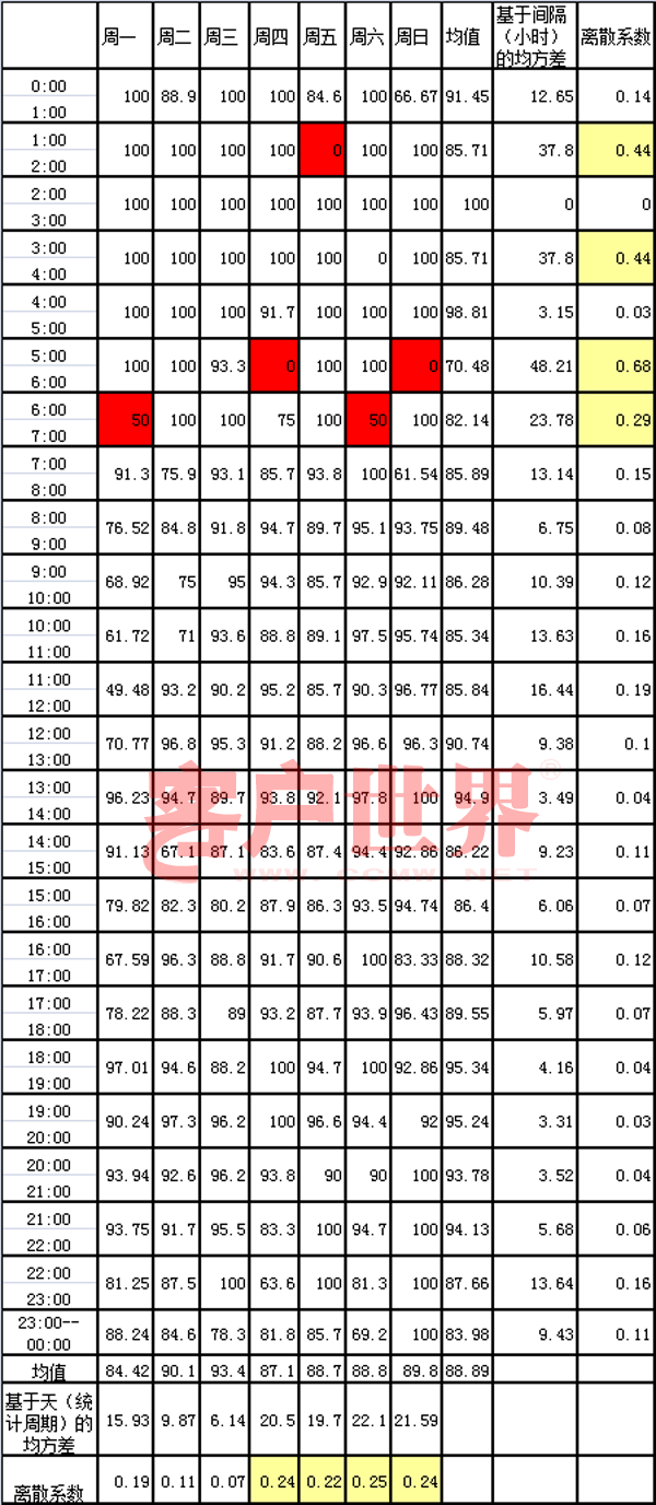 针对平均服务水平的不足,大家开始采用服务水平均方差来衡量运营的好坏。服务水平均方差又分为两种,一种是按时间间隔的均方差分析,即统计相同时间间隔在不同日期间的服务水平均方差;一种是按统计周期的均方差分析,即统计周期内不同时间间隔的均方差。