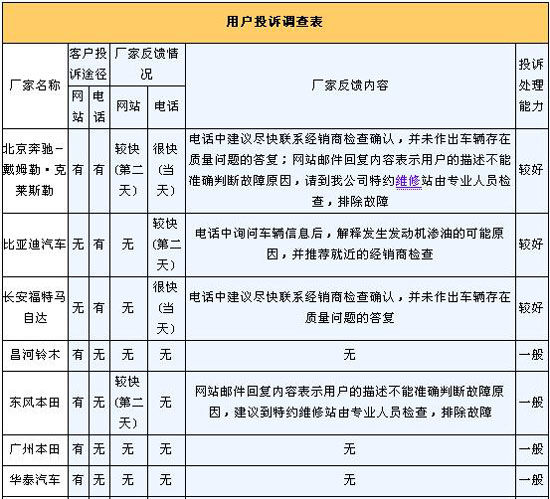 在本次《服务测评》的所有调查项目中,记者采用了和上期同样的模拟调查手段,在统一调查标准和调查方法的前提下可以帮助用户体验到厂家是如何处理投诉问题的。记者在模拟的过程中选择了具有代表性的14个厂家,它们分别是:北京奔驰-戴姆勒?克莱斯勒、比亚迪汽车、长安福特马自达、昌河铃木、东风本田、广州本田、华泰汽车、南京名爵、奇瑞汽车、上海大众大众品牌、上汽通用五菱、天津一汽、一汽-大众奥迪品牌和郑州日产。这些厂家之所以被做为具有代表性的样本,是因为它们在上文“投诉途径”的调查中有着良好的表现。