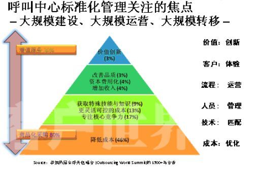 那么,对于这个尚处在”婴儿潮”时期的产业,我们最应该做些什么来呵护和培育这个产业健康有序的发展?大家要好好呵护这个行业。如果只是强调“要想让呼叫中心发展,那就需要我们多投钱,这样就能买许多机器,放在公司里面。规格有了,那呼叫中心就发展了。”我觉得这样的说法是对呼叫中心发展的错误理解。我们这个标准是希望营建专业化的产业,整个呼叫中心产业的价值金字塔,这个金字塔每年在美国有一个专场,就叫呼叫中心专场,标志一个产业成熟的金字塔是怎样的。通过调查发现,当产业进入成熟阶段,标准化服务的第一个就是降低成本,也就是提高生产效益,能够把这个产业细化分解,高度的模块化进行精细控制的时候,其他的差异化的体现。呼叫中心本身是不是成为企业核心竞争力的一部分,或者说越来越成熟的外包商出现,能够把一些企业非核心竞争力加入到自己的核心竞争力之上,这叫专业化。还有一个更加灵活可控的成本,呼叫中心的弹性从一百人到一千人,一千人到三千人的发展更加可控。还有获得特殊技能与知识,事实上呼叫中心各行各业知识都会接触,你只有专著才能做得更好,本身对于呼叫中心的从业人员来说,在这个产业中扮演的角色不是缔造一个企业的核心竞争力,怎么期望从业人员掌握更多的技能和知识,来指导更多的行业和企业。特别是在客户导向上面的发展,还有在金字塔上面增加收入,分析客户所需,让我们更好的满足客户的需求;然后资本费用化,从外包专业化领域带来的变化,很多的时候最大的一笔建设是呼叫中心,基本一个中等的呼叫中心没有500万以上的资金投入是不可想象的。