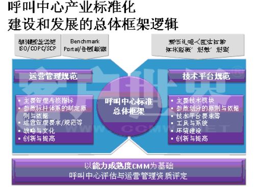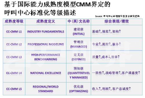 事实上,我们现在的标准化模型,请看一下CMM模型,该模型是基于近20年全球产品质量研究成果所建立,美国的Walter Shewart于上世纪30年代发表了统计质量控制成果。在Watts Hunaphrey和Ron Radice等人的研究成果之上,卡莱基.梅隆大学软件工程研究所将这套质量控制方法改造为能力成熟度框架并标明不同成熟度等级,率先在软件工程、系统工程、系统采购、继承产品和过程管理等领域实践,目前CMM模型已成为国际公认的工程规划、质量管理和流程运营方面的权威标准;CC-CMMTM正是CMM这一权威模型和新兴市场(Emerging Markets)呼叫中心产业深入研究相结合的成果。。我在前几年企业实施标准的时候深入研究了这套模型,这套模型对我们呼叫中心产业有极大的适用性,几乎每个呼叫中心都可以在这套模型找到定位,从一个浑沌的初始过程到管理者,如果能够建设一个持续的管控的流程到定义级,如何进行一致化管理,再到预知级,几乎每个呼叫中心从大到小,从年轻到发展一段时间都可以找到自己的定位,所以我们在原来的信息产业指导委员会的支持下,我们重新结合CMM模型开发出了符合我们呼叫中心发展的一个标准,我建议大家把它看成是一个模型,整个国际产业都定性了标准,因为大家都知道CMM模型是一个开放性的知识体系,并不是一个封闭标准。CMM模型,首先你的呼叫中心建设要能够符合呼叫中心的定义,不是找几台话机或对外有个一个客服号码对外就能称为呼叫中心。