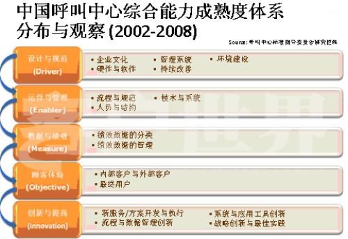 在层级上一个管理对流程指标的一些定义,可以实行持续经营;在成熟度上面,你的呼叫中心可以加入产业的标杆化建设,把你的实施进入研讨和从产业的分享当中来。四级基本上是各个地区最佳的能力成熟度,到了五级的我们定义为建设级,这样的体系最大的好处,能够在呼叫中心产业高速发展的初级阶段,可以帮助每家呼叫中心找到自己的出发点,采用有序的方式不断让自己成长为世界级的呼叫中心。