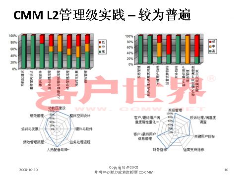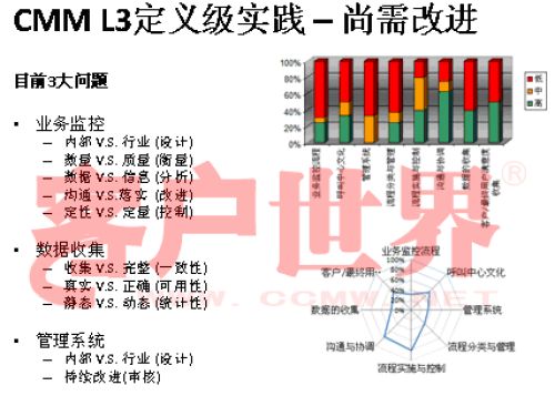 接下来我用一个很小的案例结束今天的分享,我们整个的呼叫中心的成熟度模型目前是在电信行业开始了2008年版的推广,成熟度模型经历从07年成立亚太呼叫中心产业联盟以后,由一群这个行业里面的专家,特别是中国产业市场的发展建立起的标准,一年以来在通信行业我们做的能力成熟度的判定有一些很有意思的启示,通信行业占到我们整个呼叫中心产业约70%的坐席,是最大的、最有代表性的产业。做下来真的很有代表性,普遍性在于环境建设、资产投入、资产配置,所以这下面的雷达就可以看到,相对完善都是在环境建设,功能区建设,整体空间设计、硬件相对来说比较偏硬的一些。在其他方面偏废的比较厉害。第二个雷达在一些奖惩管理、信息管理,整个软性方面几乎有很浓重的一些计划经济,制造行业的一些领域相对来说比较成熟。我们目前看到的,基本上通信行业的一些发展在能力成熟度上是二级到四级,尤其以二到三级的发展更为普遍。通常的方法为期一周的标杆调研,看所有的呼叫中心发展的五个方面,我们才会在里面做这样的判定。在能力成熟度的三级,我们做了一些企业发现,特别在三级,关于能不能对流程进行一致性管理方面,就是刚才李老师讲到的不是最急的,而管理是最重要的。可能所有的流程多多少少有一些成熟度的问题,但是我们的源头流程能力在三个方面有很大的差距:一个是业务监控流程,第二个数据收集流程,还有一个是管理系统的审核流程。这个大家可以和自己的呼叫中心比一比。