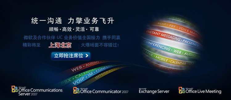 现在,这股力擎业务飞升的力量正热情来袭。它将传遍全国四大都市(北京、上海、广州、成都)及九大名城(深圳、苏州、天津、杭州、大连、南京、青岛、武汉、厦门),全面展开“微软及合作伙伴 UC 业务价值全国接力”活动。届时您可亲临活动现场,体验微软公司与 Nortel、Avaya、Mitel 等为您带来的一整套关于“统一沟通”的理念和技术应用方案,更可针对 UC 平台部署、应用及具体操作等问题,与微软技术专家以及成功部署 UC 的业界精英进行全方位的互动和交流,感受统一沟通解决方案的卓越业务价值!