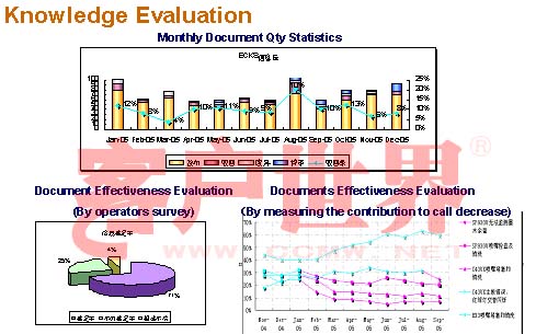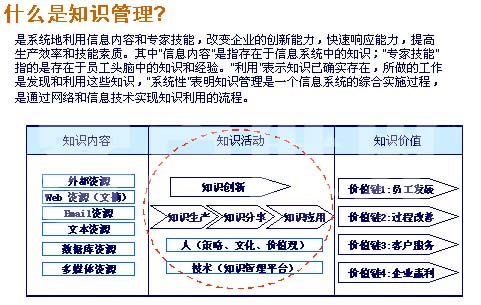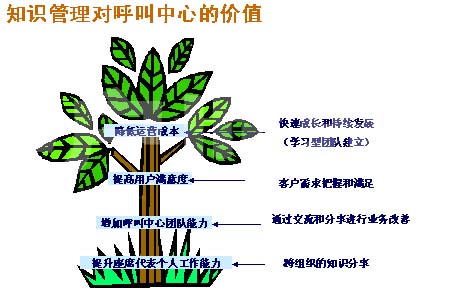 实际上我告诉大家,知识管理有两点:第一点就是说利用信息内容和专家技能来改变企业创新的能力。我这个定义有很多,我这个定义是引用了IBM公司的定义。大家可以看到,利用我们的专家技能,所有的知识管理最重要的一个是什么呢?就是我们的知识活动,要有人去参与我们的知识活动当中来,让我们的活动升值。因为我曾经有一个体会,作为呼叫中心来说,流失率永远都是很大的,你辛苦的培养了一个员工,这个员工工作了一年以后,他走掉了,他走掉了以后什么都没有留下。因为前一段时间我自己有一个体会,我去阅读我们的知识库的时候,我看到了2004年的时候,我的一个员工写的一幅文章,他分享了他的经验,但是这个员工我都记不得他的相貌,但是我读到的时候,我还是感觉到这个员工就好像在我们这里工作一样,实际上这就是简单的知识管理,知识管理人走了以后,会把他的经验保存下来,说得不好听一点,会世代相传,所以培养你的员工,投入了这么大的成本,让他把经验分享下来,保存下来,让后来的同事读了以后,还会丰富它,所以说这就是知识管理,所以很多人感觉到知识管理就是知识提供,我是把很多的信息提供过来就可以了,实际不一样。