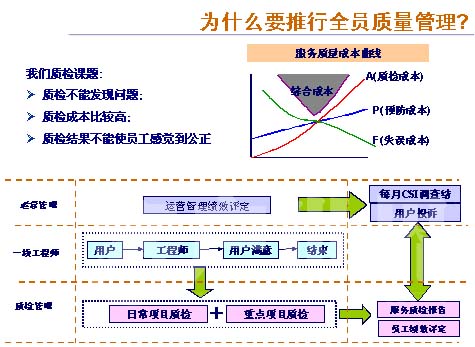 全员质量管理的方法还是有一个插曲,第一个为什么要引进全员质量管理?实际上我们的企业,作为呼叫中心来说,都有质检的人员,质检的人员好像从来不会出错。因为什么呢?因为他从来不会面对用户的电话,而出错的永远是一线的工程师。那出了问题以后,质检人员就会说你出了问题,特别是当投诉发生了以后,每个人都会直接去追查一线工程师的能力,他服务的质量,没有人去追查我们的质检人员,所以说我有个体会,因为有一次我们的一个同事,可能在跟用户做电话交流的时候,发生了不愉快,用户可能特别生气,就比较脏的字骂了我们的同事。我们的同事可能感到心理特不平衡,回到家以后睡不着觉,马上打电话骂这个用户,那这个用户很快就投诉过来,出现了这个问题以后,按照以前的方法,我们很快就要跟这个同事解除合同,因为感觉到太严厉了。但是我们现在就想这个同事出现这个问题,为什么我们质检的人员没有发现它?所以通过这个方面感觉到,我们不但要去实时地监控我们一线的工程师,而且我们还要提高质检人员的能力,让我们的质检人员来推广我们全员的质量管理。