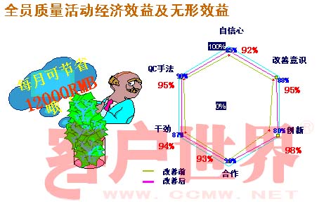 刚才说的全面质量管理的话,实际上除了提高员工发现问题、解决问题的能力以后,还有很多的收益,包括员工的自信心,改善问题的意识,创新的意识,合作的意识,还有他工作的热情,还有QC的手法,可以看到我们自己也做了一个内部调查,在改善前和改善后,我们整体的七个隐性、无形的资产都得到了一个很好的提升。