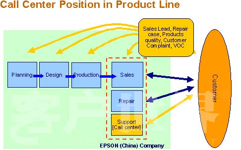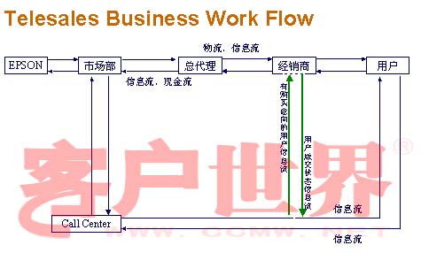 第一个就是我们的电话销售,可以看到在开展这个电话销售之前,爱普生所有的销售都是渠道销售,渠道销售的特点是什么呢?就是所有的产品从爱普生,到我们的总代理,到我们的经销商,很多种渠道,然后到我们的用户,所有的信息流、现金流是这么传递,那我们的物流也是相反的方向去传递。那有了电话销售以后,大家可以看到,整个爱普生和我们的用户之间大大缩短了距离,所有的用户跟我们市场部门,通过呼叫中心是紧密地把它结合在一起。以前用户的销售信息如果传递到我们的总部的话,可以看到每一层传递都是有损失的,这么多的传递,最后传递到公司的话,你这个信息已经是有很大的变化,现在通过这个Telesales,把用户跟我们的总部结合在一起,我们也加强了跟用户的沟通,购买的意向都是把它提供到我们的经销商,由经销商及时地把这个产品成交的信息反馈到呼叫中心。