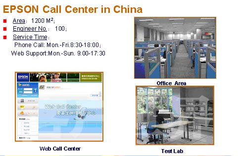 下面还是给大家近距离地接触一下爱普生的热线服务中心,实际上爱普生的热线服务中心规模不是很大,只有区区的一百个人,但是我感到有句话是麻雀虽小、五脏俱全,无论是几千人的呼叫中心,还是几十人的呼叫中心,实际上从管理的模式和手法上面是一样的,整个爱普生的呼叫中心只有100个人,但是我们的服务时间也没有什么特殊,跟大家分享的就是这样,实际上对爱普生来说,也是实行了这种差异化的服务,大家可以看到我们的电话服务,对普通用户来说是周一到周五,早上的8点半到下午的6点;那对于互联网的服务,我们是七天的服务,是从上午的9点到下午的5点半,实际上这种时间的设置是引导公司用户从电话服务来选择我们的互联网服务,因为很多嘉宾都提到互联网的服务成本相对于电话来说更低一些,所以我们要鼓励更多的用户去选择我们的互联网服务。下面这几个照片就是爱普生的呼叫中心,提供给大家,希望大家对我们爱普生的呼叫中心有一个很好的了解。再一个我提到了,爱普生也推出了WEB呼叫中心,互联网呼叫中心,这个是我们在2005年的时候就推出来互联网的服务,实际上服务的内容与电话服务最大的区别是什么?也就是说我们把这种电话服务很多排队的技术,很多排班的技术,还有很多的技术都应用到了WEB Call Center上面,但用户定位不同,对于互联网的呼叫中心基本上都是高端用户,实际上对于呼叫中心来说,怎么样通过我们差异化的服务来使用户享受到不同的服务,实际上也是呼叫中心面临的一个课题。