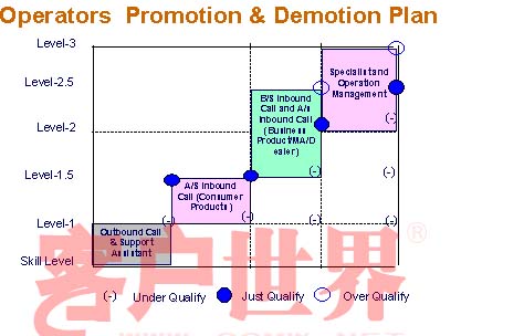 下面一个我还是对呼叫中心本身来说,上一页的内容是在整个公司的集团里面怎么去定义呼叫中心人员的技术定位。那对于呼叫中心本身来说,实际上也不是所有的工程师和座席服务代表他的技能都是一样的,可以看到不同的座席服务代表他的定义是不一样的,从Level1到Level3,对每一个阶段的员工来说,都有一个被提升的空间。同时作为高一级的座席服务代表,如果他的表现不好的话,也都有被降格的路径,所以说这样的话,就两条路比较公平,比较公正。