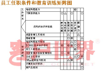 刚才讲了,从大的方面到小的方面所有培训的定义,下面给大家分享一个工具,我感觉这个工具也不是特别的,只是我感觉特别有用,就是和大家分享怎么样进行员工培训。大家知道每一个企业都要有JED的描述,都要有MBO,怎么把这两点结合起来,通过培训把这两点串联起来?给大家推荐一个矩阵图,上面是他JE的描述,后面是培训的课程,这是他的技能,通过这个矩阵图把它关联起来,这样你就可以了解每一个岗位对培训有哪些具体的要求,对这个岗位要提供哪些内容的培训。