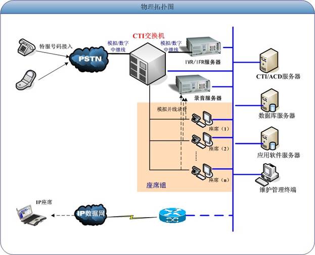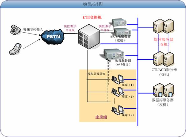 •数据库服务器:负责业务数据、系统数据(包括话单、历史记录等)、座席资料、座席操作信息、客户操作信息的存储与管理。业务少时可与CTI服务器共用一台机器。