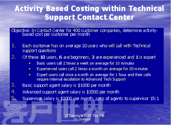 我们将举例说明我们如何为一个呼叫中心使用行动成本法,以确定服务一个客户所花费的成本。我们将在一个技术支持呼叫中心中举例。在这样一种呼叫中心中,座席员为带着问题呼入的客户提供技术协助。查明服务一个客户所花费的成本的一个主要的原因是懂得如何为技术支持定价,以至于我们知道如何为了赢利去收费。如果我们精确地了解对每个客户上所花费的成本,我们的定价策略就不用再依赖于猜测工作。