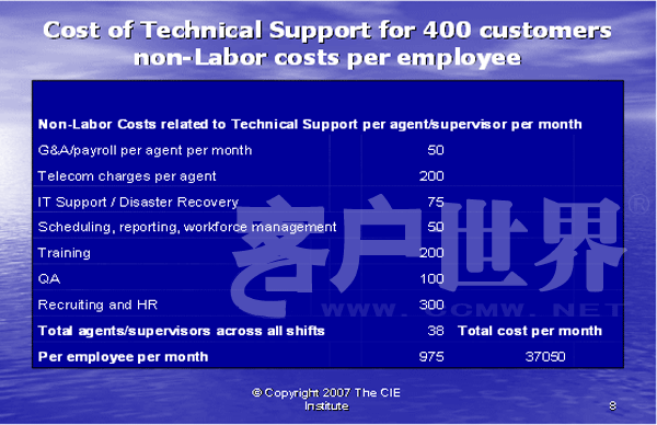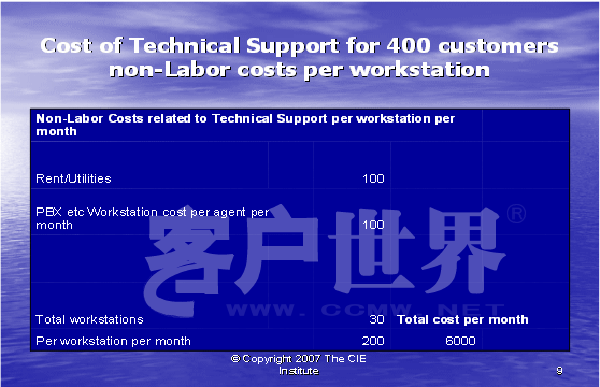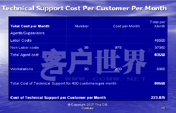 最后,我们可以如同下面图表10所示,把所有的信息放在一起。每个客户的技术支持的实际成本包括间接人工成本和工作场地成本,这是服务一个客户所花费成本的正确的反映。