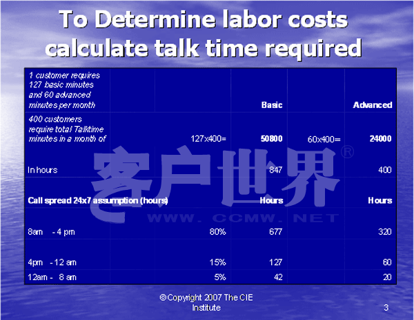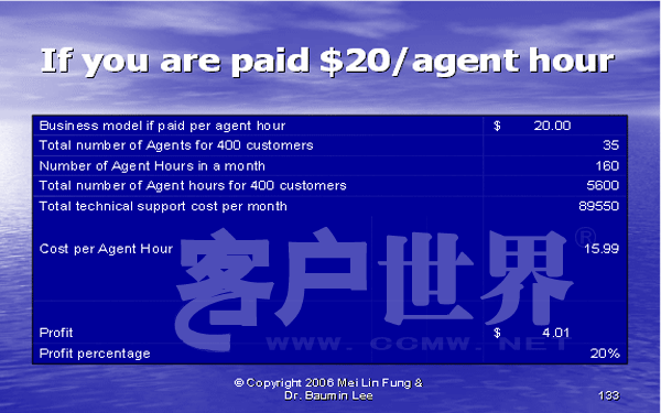 比较方式1和方式2,我们将很容易发现通过收入百分比付薪的利润率要高于不变的按时计薪。使用ABC法不仅给呼叫中心主管关于提供服务的每个行动更详细的成本细目分类,而且还可以使用它在你的合同ROI分析中评估不同的定价方案。如果一个呼叫中心服务是根据你的服务所产生的收入百分比付薪的,它将激励你的呼叫中心的员工推动更高的收入额。另一方面,如果呼叫中心服务是通过不变的小时付薪,那么你的主管就会利用尽可能多的座席,这与降低成本是背道而驰的。