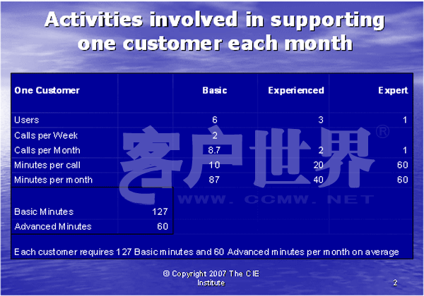 图表1为我们提供了重要的信息,有助于我们计算一般的客户在基础和高级两种技术支持中所需的技术支持的通话时长。我们需要区分这两种技术支持,因为提供高级技术支持的座席的月薪是2000美元,比提供基础技术支持,月薪为1000美元的座席每月所花的成本要高。那么,面临有经验的客户使用者时该怎么做呢?因为只有专业客户使用者才能要求高级座席支持,所以他们的需要似乎可以由与初级客户使用者打交道的基础座席处理。