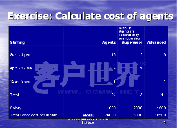 我们下一步就是计算出主管的成本。每次排班至少需要一个主管,如果这一排班的座席数要少一些,主管则也应该能够处理一些技术支持的电话。在这个例子中,我们将假设主管拥有高级支持座席的技术技巧。在图表5中,你将看到我们使用了图表4所得出的座席数,并假设这是每次排班话务量中所需的各种类型员工的数量:基础,高级和主管。我们同时用图表1中的薪资去计算座席和主管支持400个客户的总成本。通过把每种座席单独的成本相加(24个基础座席,11个高级座席和3个主管),得出每月的人工成本为46,500美元。